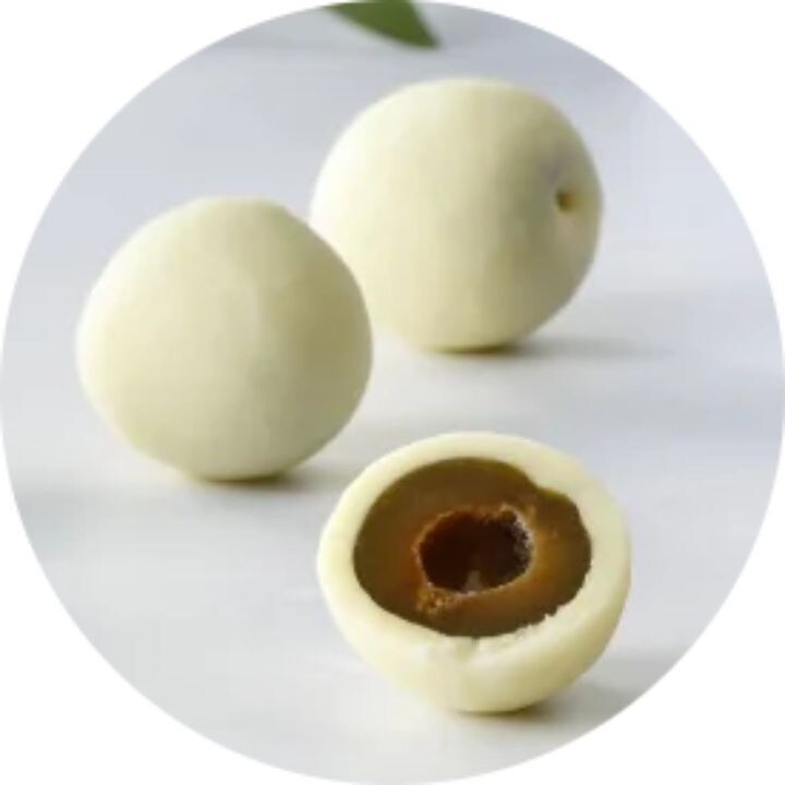 シャンパンやワインとの相性もよい、大人味の「ピュアココ オリーブ」。グラッセしたオリーブをホワイトチョコレートでコーティングしました。
