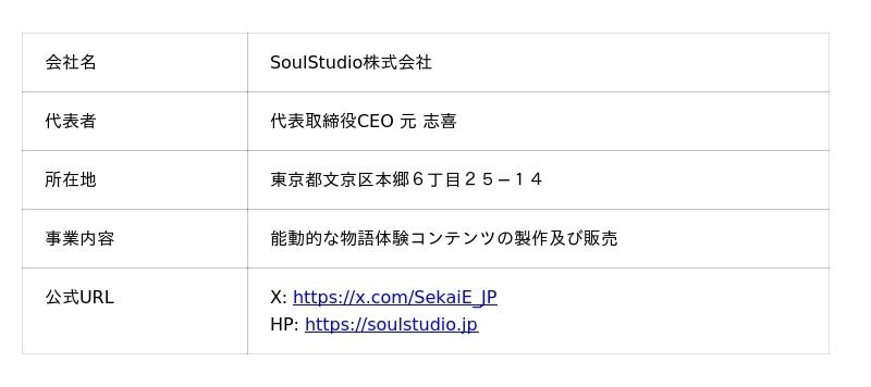 SoulStudio(旧セカイヘ)は「作品世界を生きられる未来を創る」というビジョンのもと、受け手が作品世界の住民となって能動的に物語を体験できるコンテンツを製作する会社です。2023年9月に設立された東大発スタートアップです。複数のアニメ作品におけるSoulChatコンテンツを製作し、提供しています。LINEスタンプを介して作品世界と物々交換を行うチャットコンテンツは、業界初の試みとなります(2026年2月時点、弊社独自調査)。