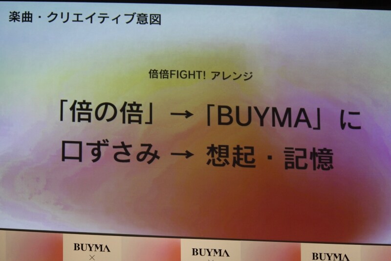 「倍倍FIGHT!」をCM用にアレンジし、「倍倍」というフレーズから「BUYMA」を想起させる狙いがあります。キャッチーなフレーズと親和性の高いリズムを活かし、ブランド名の想起を目的としています。