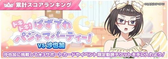 4月3日(金) 12:00よりイベント「ドキドキ!ぱずでれパジャマパーティー! VS沙也加」を開催します。当イベントでは、期間中の累計スコア順位に応じたランキング報酬が獲得可能です。またイベントステージで集めたポイントで、イベント限定のサポートカードやアイテムが獲得できる「ポイント交換所」も登場。繰り返し挑戦してよりたくさんのポイントを集め☆3サポートカードや勧誘チケットを手に入れよう!