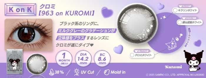 DIA:14.2mm/着色外径:13.6mm/含水率:38%。クロミらしいダークな雰囲気と遊び心をミックスした「963」モチーフが印象的。瞳にさりげないインパクトを与えます。