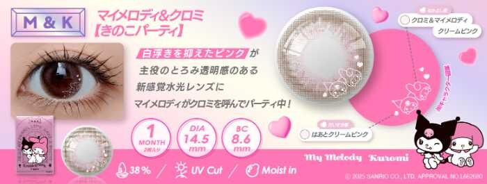 レンズカラーはクロミ「963 on KUROMI」と、マイメロディ「きのこパーティ」の2種展開。トーン数は3トーン仕様で、奥行きのある瞳を演出します。