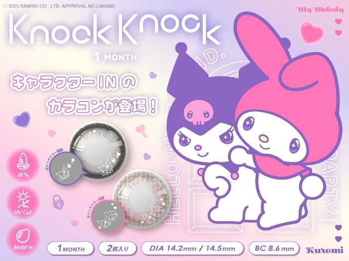 粧美堂のカラコンブランド「Knock Knock(ノックノック)」から、サンリオの大人気キャラクター「マイメロディ」と「クロミ」がプロデュースする第3弾シリーズがついに発売されました。今回は1monthタイプが登場し、2種類のレンズデザインで瞳を可愛く彩ります。クロミの遊び心あふれるデザインや、マイメロディらしいきのこモチーフのレンズは、キャラクターの個性をそのまま映したスペシャルな仕上がりです。大切な瞳に寄り添う安全性と、毎日のおしゃれを叶える可愛さを兼ね備えた最新カラコンをチェックしてみましょう♡