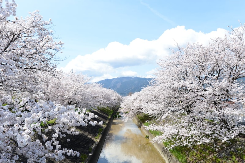 南北約2.5kmにわたって続く「高田千本桜」は、1948年の大和高田市・市制施行を記念して植樹されたもの。約1,200本もの桜は、地域住民や当時奈良に駐留していた米軍将校らからの寄付によって植えられたそうです。近鉄南大阪線・大阪線の橋梁を走り抜ける電車と桜のコラボレーションは、カメラマンや鉄道ファンにも大人気! 川沿いの遊歩道から見上げる桜並木は、まさに圧巻の美しさです。中心にある大中公園では屋台の出店もあり、夜になるとぼんぼりが灯って幻想的な夜桜も楽しめます。昼夜を問わず、お花見気分を存分に満喫できるスポットです。