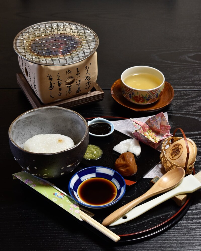 源義経の恋人・静御前(しずかごぜん)ゆかりの地に建つ古民家カフェ「静カフェ」。ここでは、各テーブルに用意されたミニ七輪を使って、自分でお団子やおにぎりを焼く楽しい体験ができます。パチパチと香ばしく焼ける音に耳を傾けながら、焼き上がったら豊富なトッピングで自分好みにカスタマイズ!