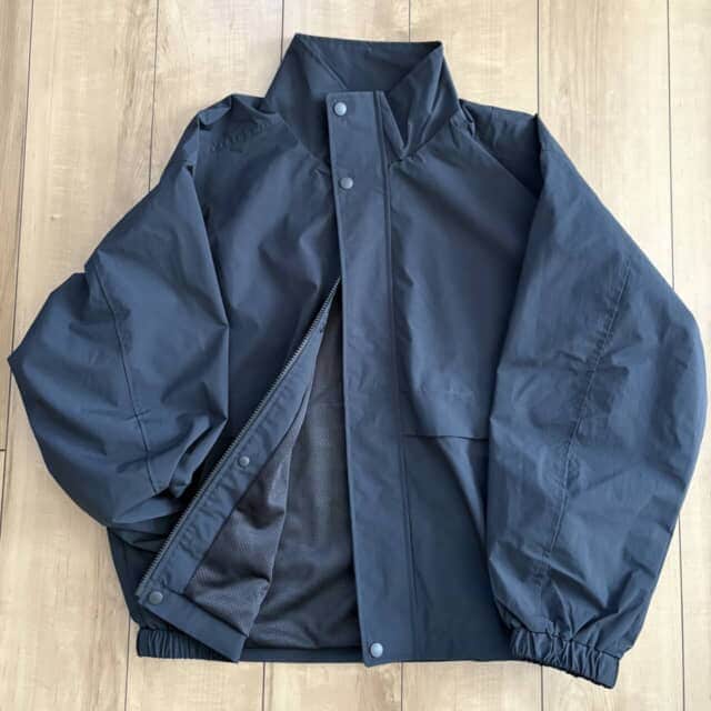 高機能アウターを大人が着るときにまず見直したいのがシルエット。シャープで直線的なデザインよりも、少し丸みのあるフォルムを選ぶだけで、印象はぐっとやわらかくなります。【GU(ジーユー)】のメンズ「ウィンドプルーフセーリングジャケット」(¥3,990)は、スタンドカラーとブラウジングによって自然な立体感が出る1着。メンズ特有のほどよいボリュームが、体のラインを拾いすぎず、結果的にすっきり見せてくれます。