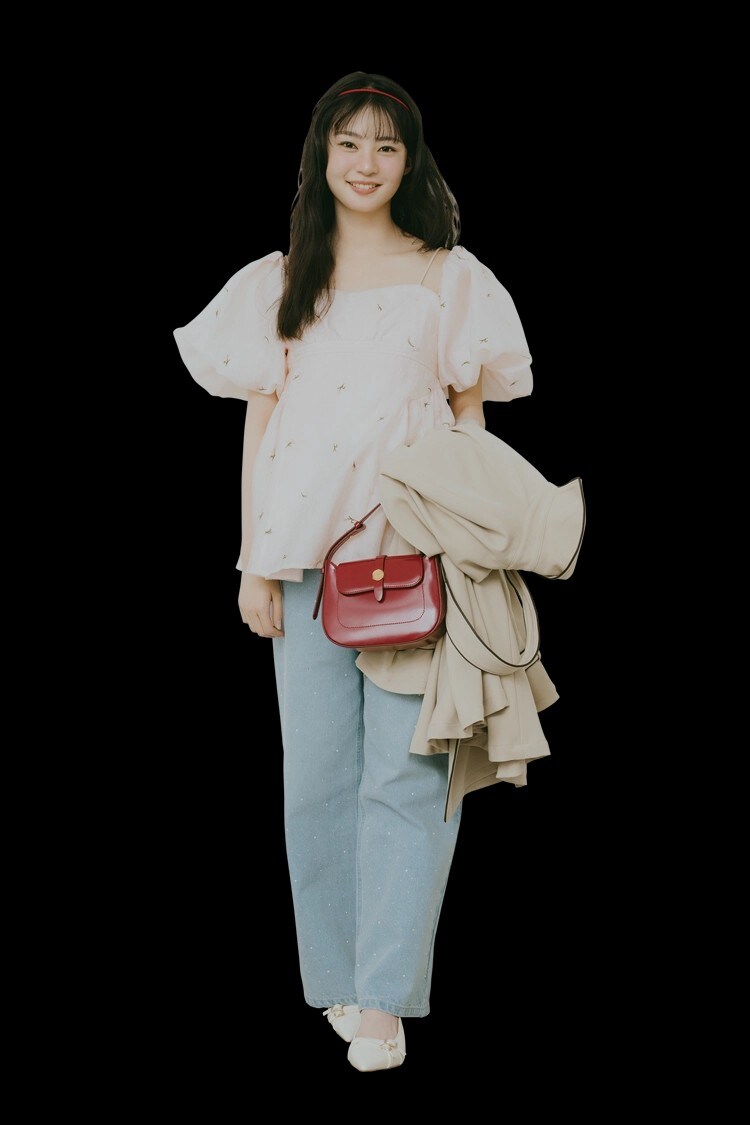 華やかなパフスリーブトップスをあわせた春コーデ。カチューシャとバッグの赤がアクセントに♡