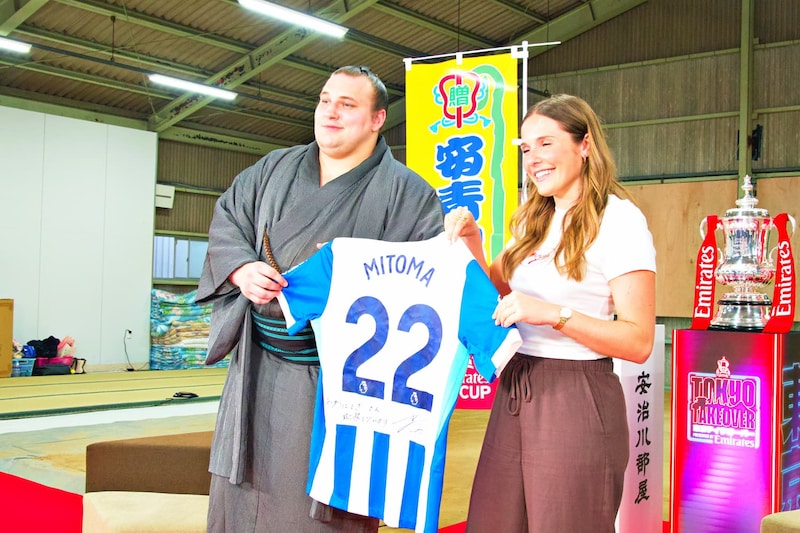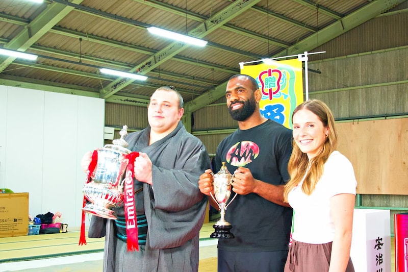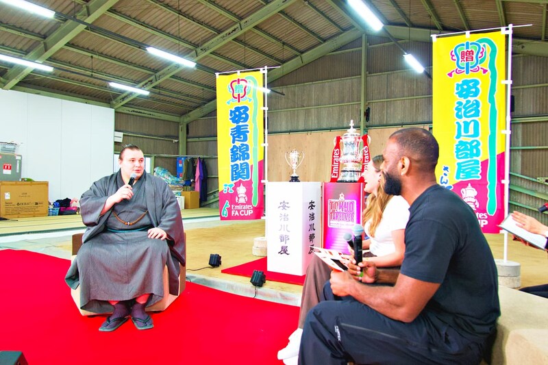 イベントは、現在相撲界で大躍進を遂げて、自身もサッカーファンとして知られる、ウクライナ出身の新大関・安青錦新大(あおにしき あらた)さんを迎え、エミレーツ FA カップトロフィーツアー担当者のダニエル・エンティーさん、オリビア・ブザグロさんという、2つのスポーツカルチャーの枠を超えた、特別対談からスタート。