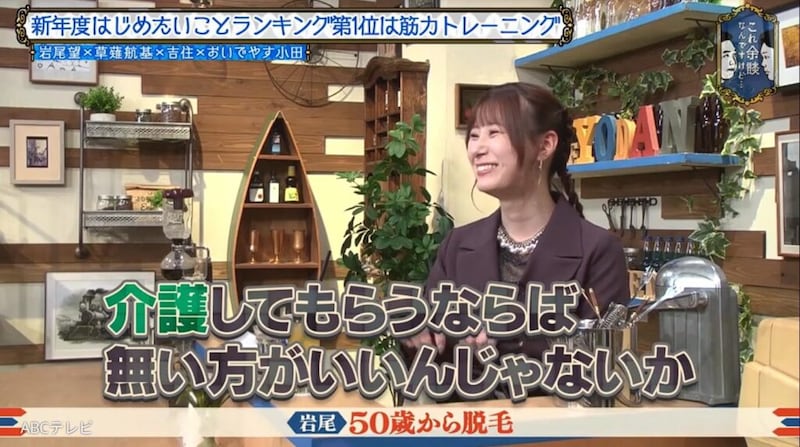 脱毛について岩尾は、「誰のためにキレイになっているかというより、面倒見てもらうことを想像してやりだしている」とのこと。脱毛にまさかの理由があったことに山内は、「もう介護のことも考えてはるんですね」「岩尾さんは終活に入られた」とツッコみ、スタジオ一同と苦笑いした。