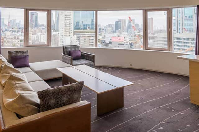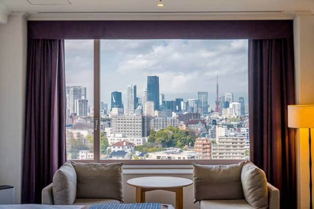 広い窓からは日本を代表する建築家、村野藤吾が設計したグランドプリンスホテル新高輪の客室棟をダイナミックなアングルで眺望。時期は未定ながら閉館が予定されている建物だけに、この部屋から目に焼き付けておけるのも貴重な体験です。