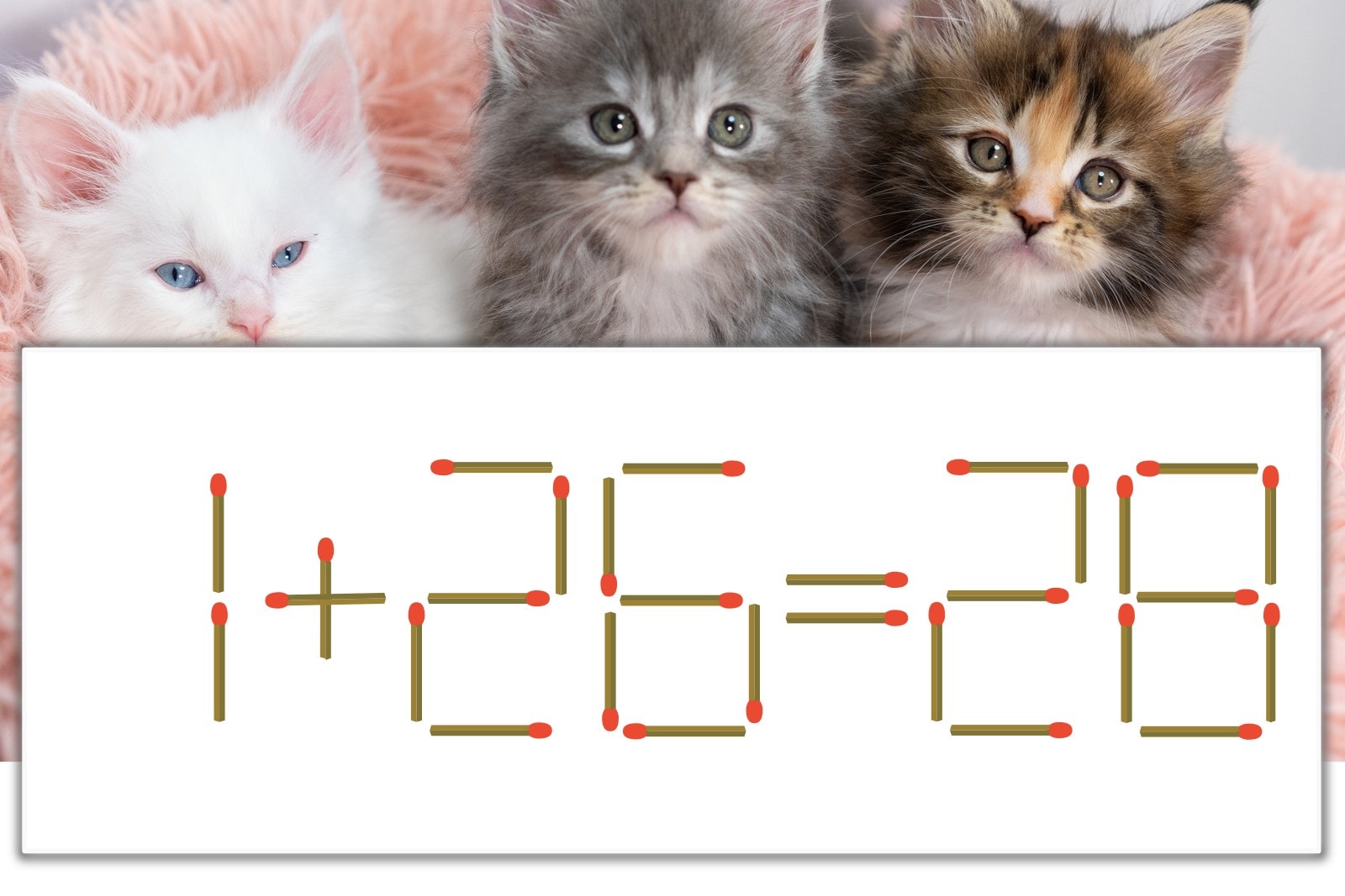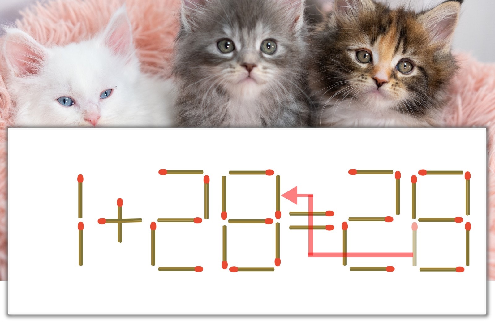 「8」を別の数字に変化させると答えが導き出せます。「8」のマッチ棒を1本移動して、「6」を「8」にしてみましょう。すると、「1+28=29」が成立します。