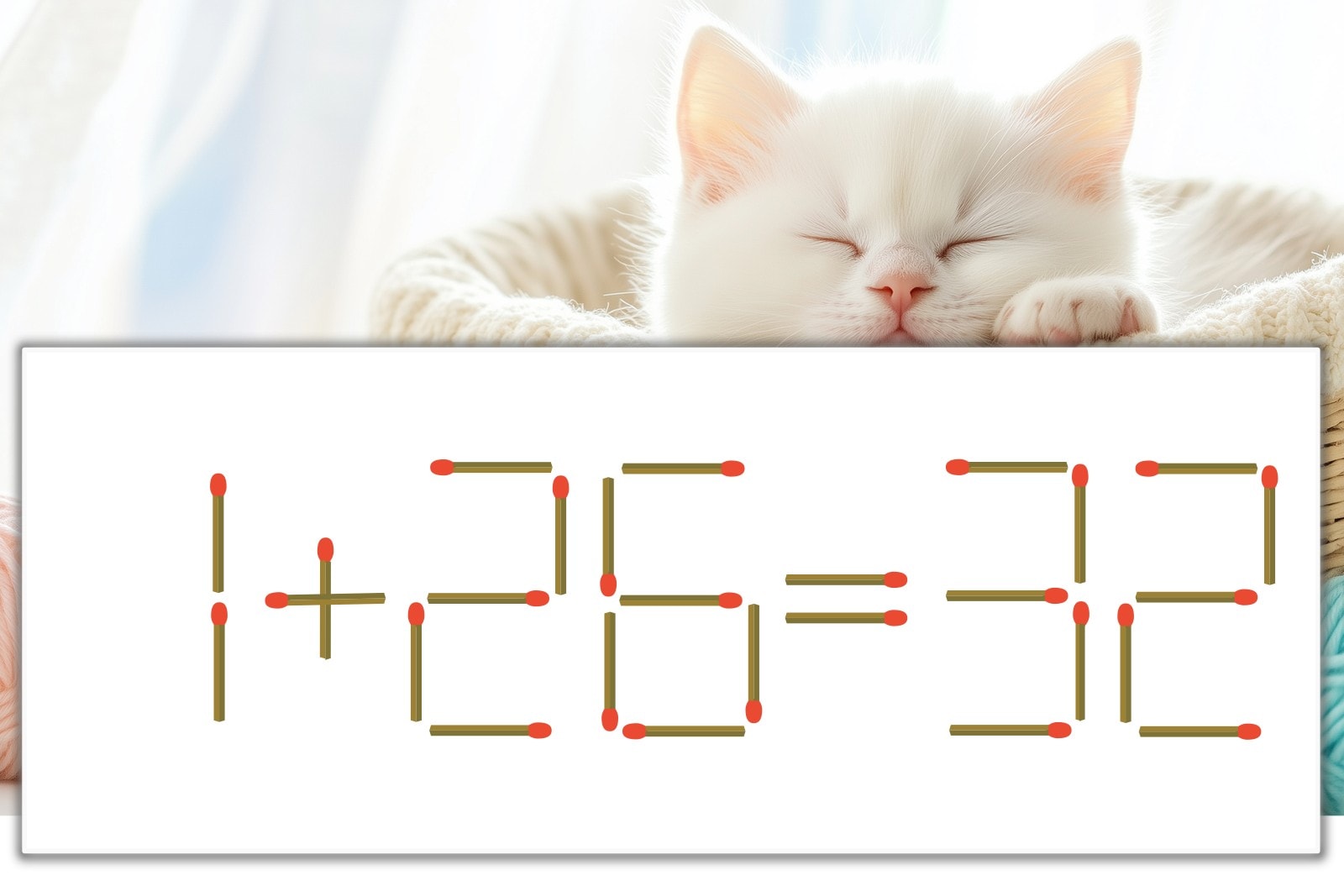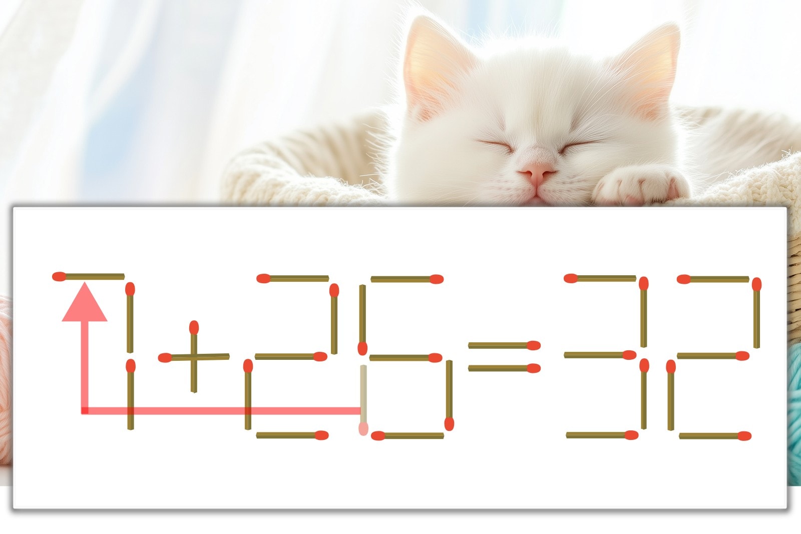 「6」を別の数字に変化させると答えが導き出せます。「6」のマッチ棒を1本移動して、「1」を「7」にしてみましょう。すると、「7+25=32」が成立します。