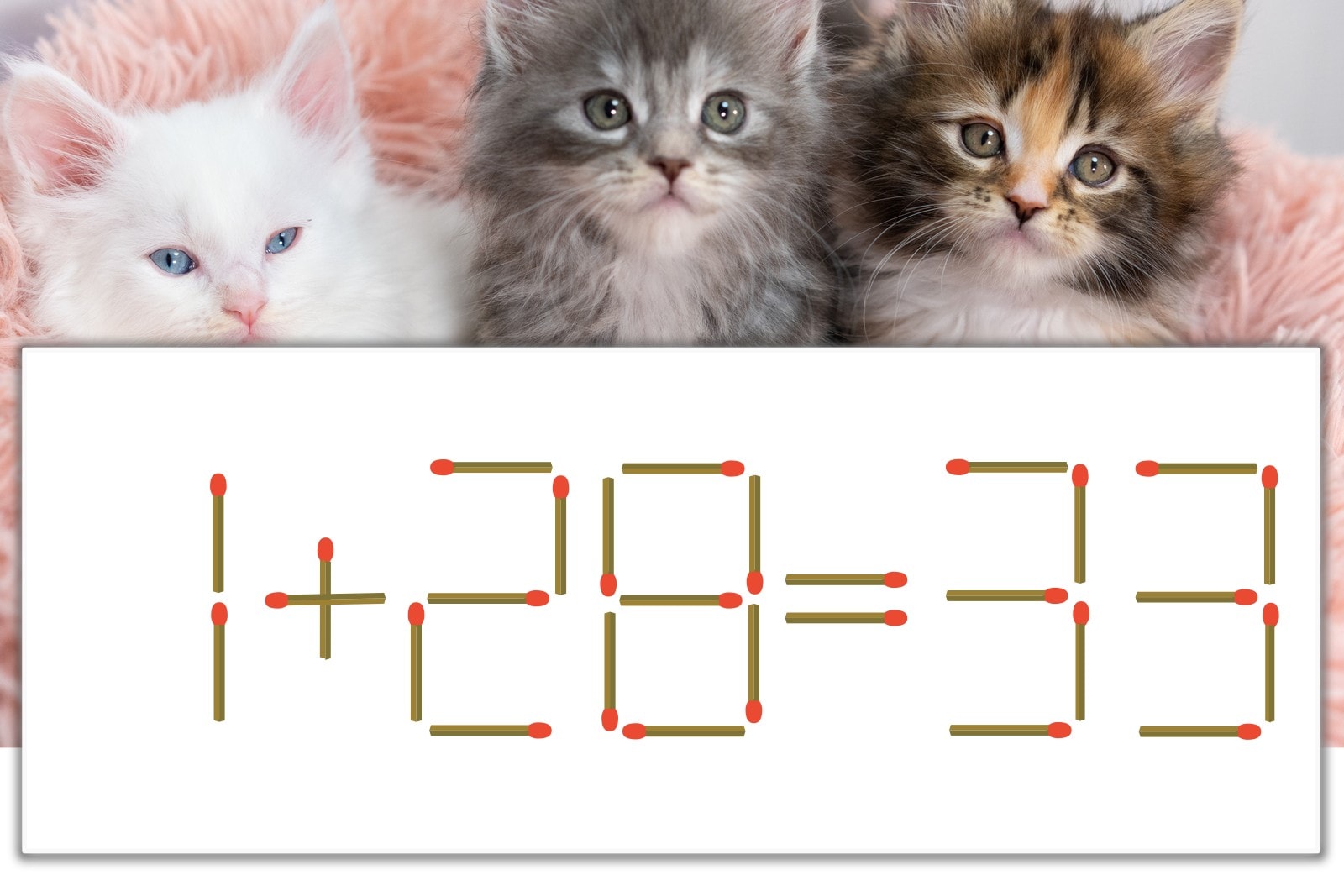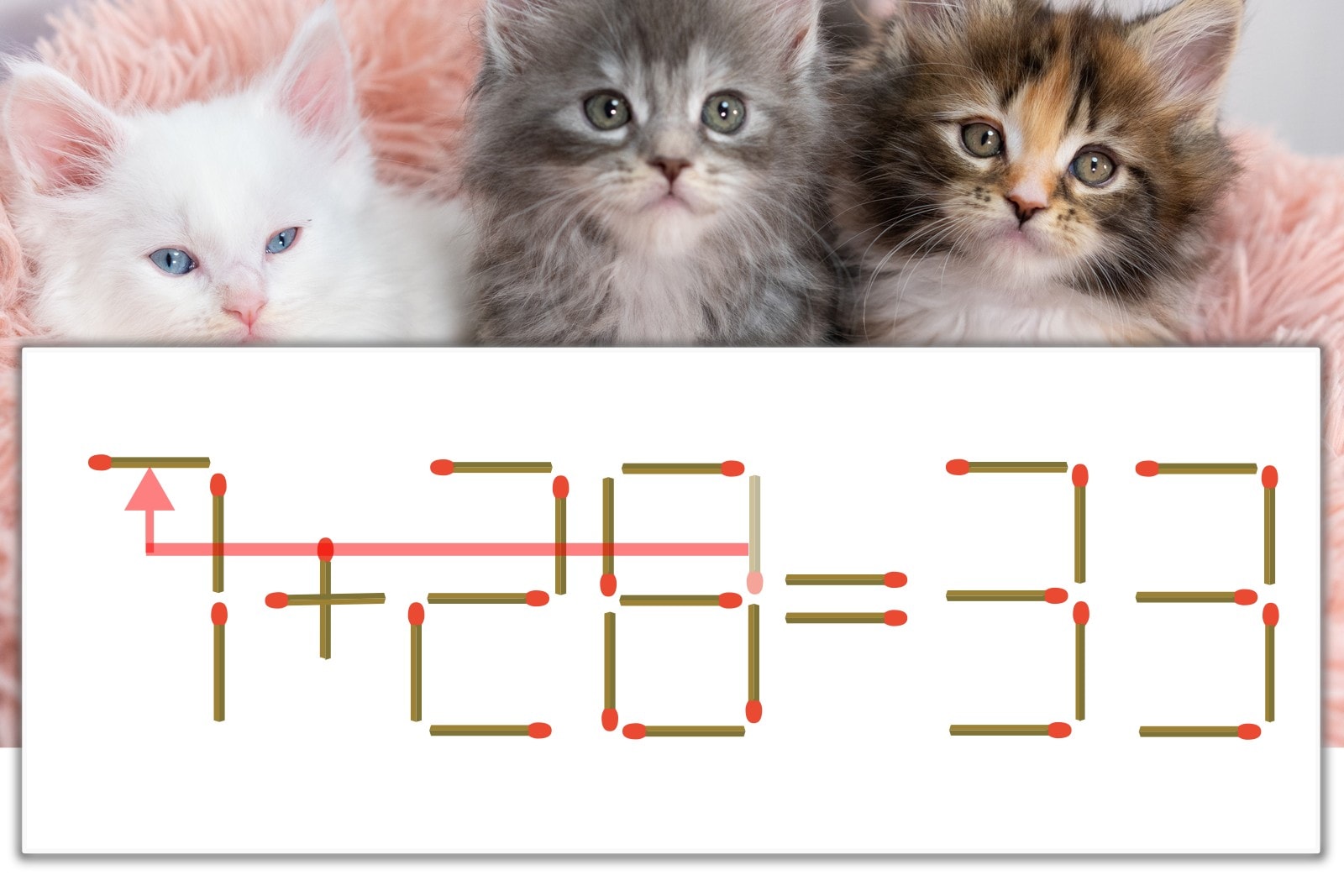 「8」を別の数字に変化させると答えが導き出せます。「8」のマッチ棒を1本移動して、「1」を「7」にしてみましょう。すると、「7+26=33」が成立します。