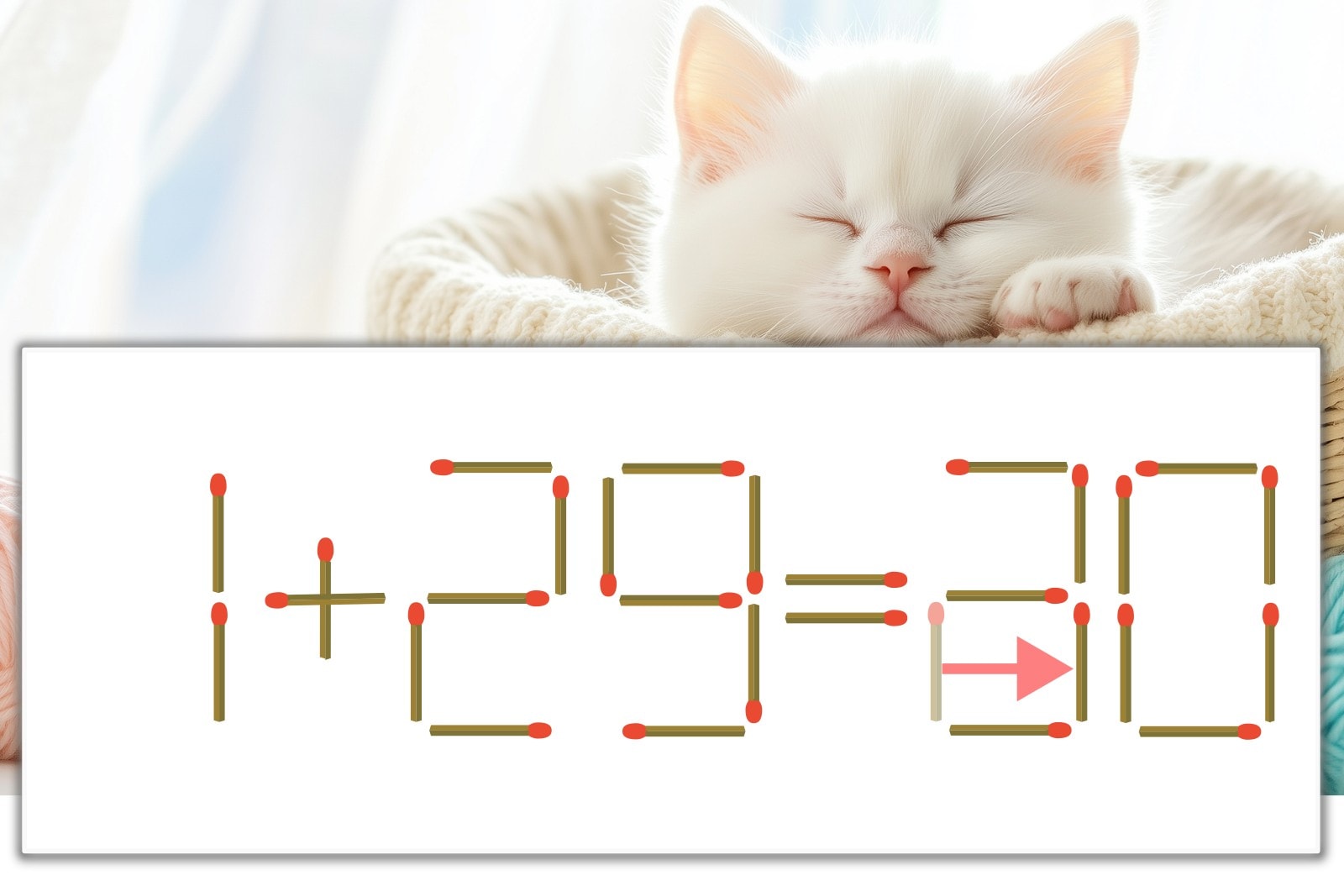 「2」を別の数字に変化させると答えが導き出せます。「2」のマッチ棒を1本移動して、「2」を「3」にしてみましょう。すると、「1+29=30」が成立します。