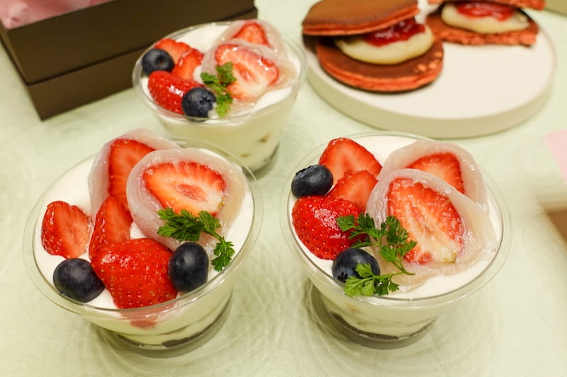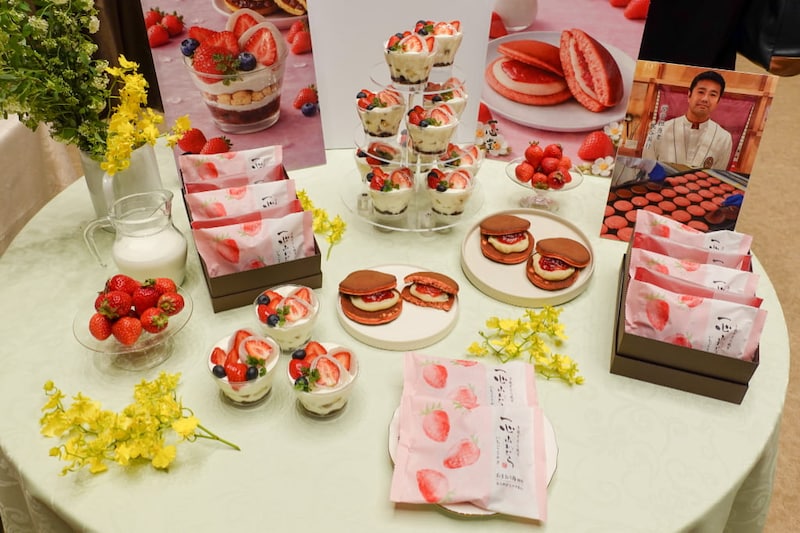 いちごの和菓子を期間限定で提供中。5月中旬まで販売する「一心ふわどら いちごミルク」は、いちご味の生地にミルクあんといちごジャムをサンドしたどらやき。4月下旬までは、阪急うめだ本店限定「いちご大福とふわどらのパフェ」の販売もあります。