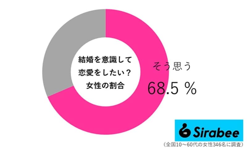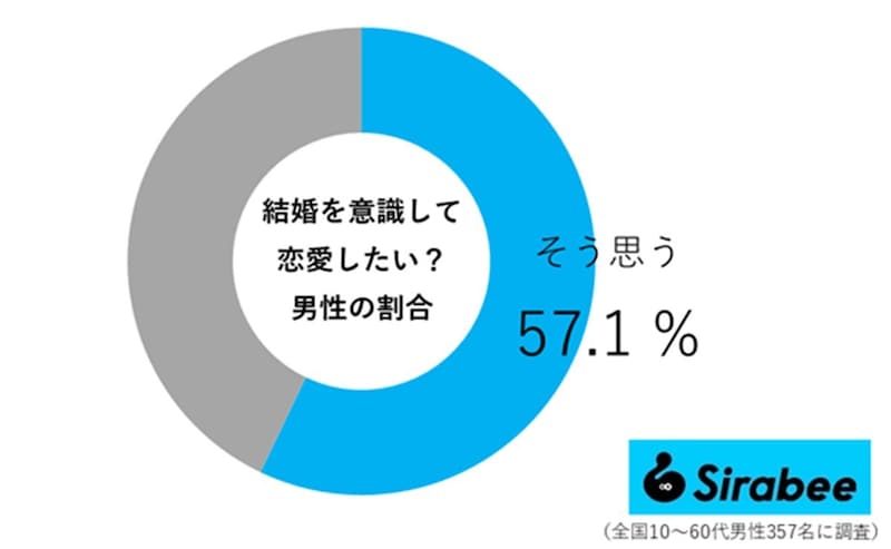 ■結婚を意識して恋愛したい人の割合まずは、Sirabee編集部が「結婚を意識して恋愛したいか」について、アンケート調査を実施。すると、男女703人の回答を得ることができ、男性57.1%女性68.5%が「そう思う」と回答しました。