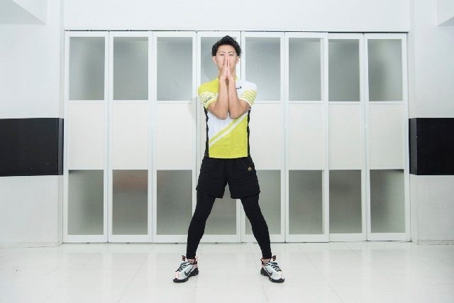 (1)直立した状態から脚を肩幅より少し開いて、胸の前で手のひらと両ひじを合わせる