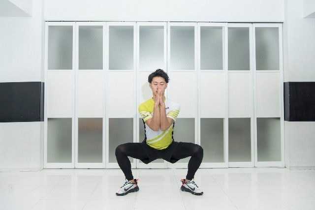 (2)(1)の姿勢をキープしたまま腰を落としていき、ひざが直角になったところで15秒間キープする