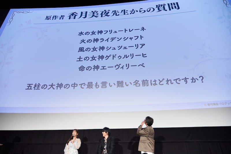 さらに香月先生からキャストへ「五柱の大神(水の女神フリュートレーネ、火の神ライデンチャフト、風の女神シュツェーリア、土の女神ゲドゥルリーヒ、命の神エーヴィリーベ)の中で、もっとも言い難い名前はどれですか?」という逆質問も。井上さんは「もうホントに言いにくくて嫌(笑)」とポツリ。加えて「僕、声優になって52年になるんですけど、スタジオに行く前に、こんなに練習をしたことがないです」と述べて会場から笑いが起き、速水さんも「僕は確実に決まってます。『風の女神シュツェーリア』です」とコメント。