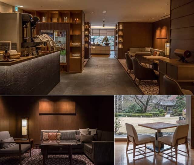 ▲日本庭園が見える窓辺の席とシックなバーエリアを備えます