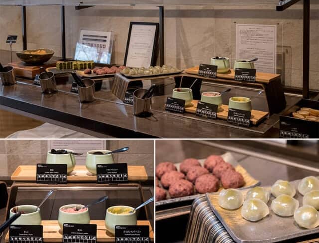 「クラブラウンジ 花雅」は和風の甘味やおつまみを中心にそろえます。ティータイムは最中にお好みの餡を詰めたり、おはぎや雷おこしなども並びます。