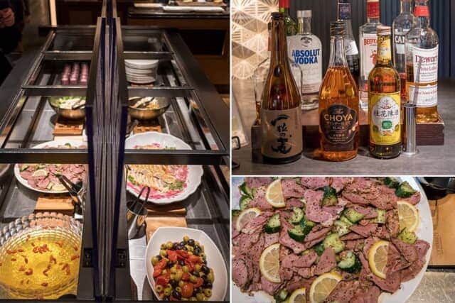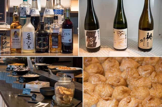 カクテルタイムのおつまみは、稲荷寿司や筍と蕗の土佐煮などの日本食。ウイスキーやジン、ウォッカなどの洋酒に加え、生ビールは「ザ・プレミアム・モルツ」と「アサヒ プレミアム生ビール 熟撰」の2種類です。この日の日本酒は盛岡の「あさ開」、青森県奥入瀬町の「桃川」とともに、青梅市に蔵を構える「澤乃井」が並び、地元東京の味を楽しめるとともに、それぞれの地域で人気の味が選ばれています。