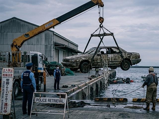 富山湾から引き揚げられた車