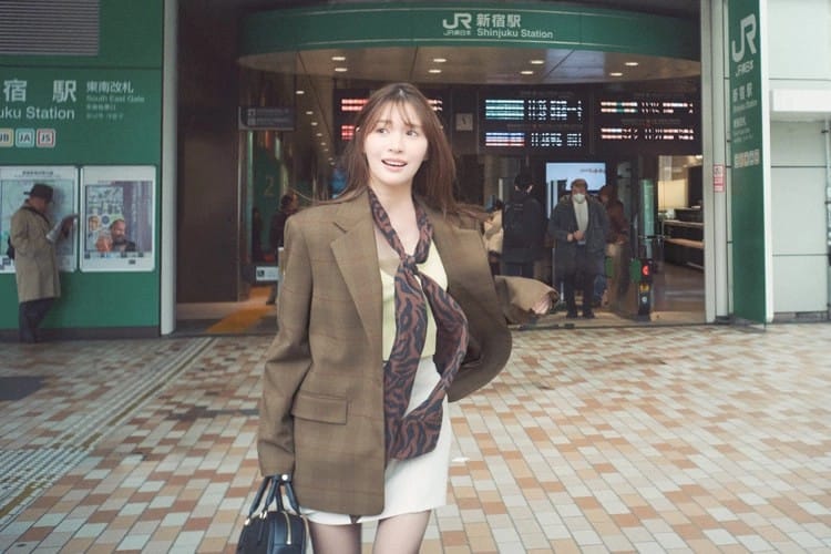 チェックジャケット は着回し。カーディガン(カーディガンとキャミソールのセット)12,100円/rienda(バロックジャパンリミテッド)ミニスカート 14,300円/MERCURYDUO ルミネエスト新宿店 キャミソール 4,950円/COCO DEAL(ココ ディール)スカーフ 17,000円/KUME タイツ 770円/靴下屋(Tabio)バッグとスカーフのセット 10,890円/RANDA