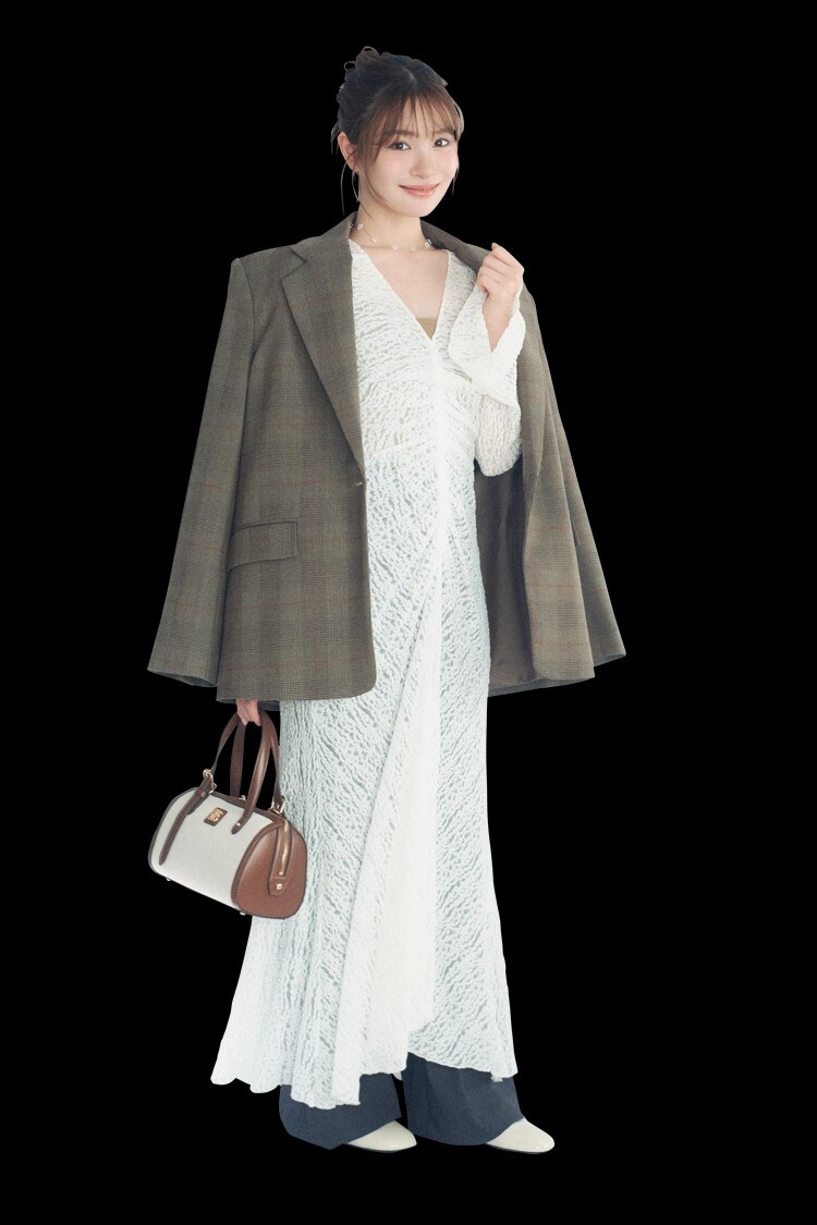 チェックジャケットは着回し。ワンピース 16,500円/COCO DEAL(ココ ディール)フリルつきスラックス 15,955円/ROSE FRANTZ(HANA SHOWROOM)ネックレス 3,080円/アネモネ(サンポークリエイト)バッグ 11,990円/RANDA スニーカー 17,600円/プラスダイアナ(ダイアナ 銀座本店)インナー/スタイリスト私物