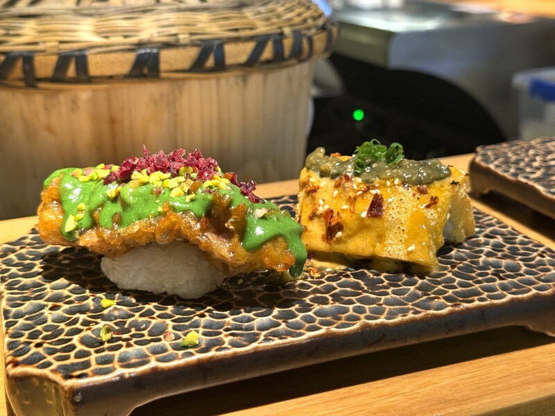 その横、抹茶炸魚寿司、フライに抹茶ソースとピスタチオが乗る、日本でも中東でも考えつかないような斬新すぎる構成。色がバイオハザードみたいな色をしていますが、意外とこれは無理じゃなかったです。その横にあるのは皮蛋豆腐寿司!変な寿司ではありますが、皮蛋(ピータン)が苦手じゃない人からすれば普通に美味しい卵寿司。そうか、これ玉子焼きの代わりなのか……。