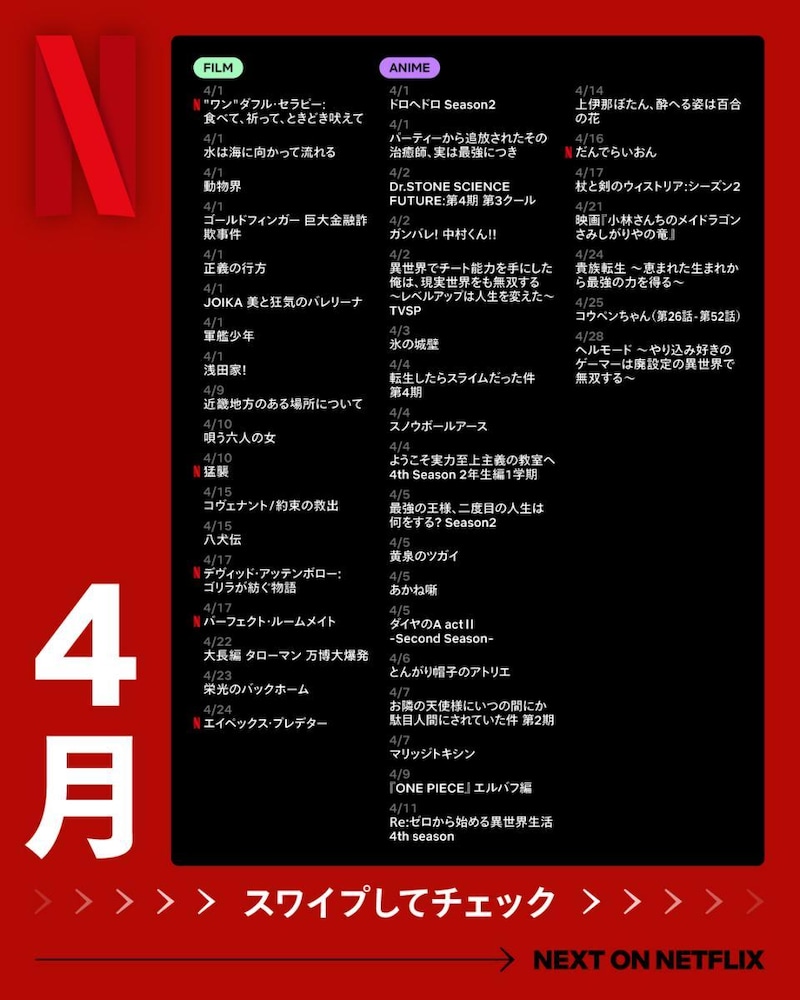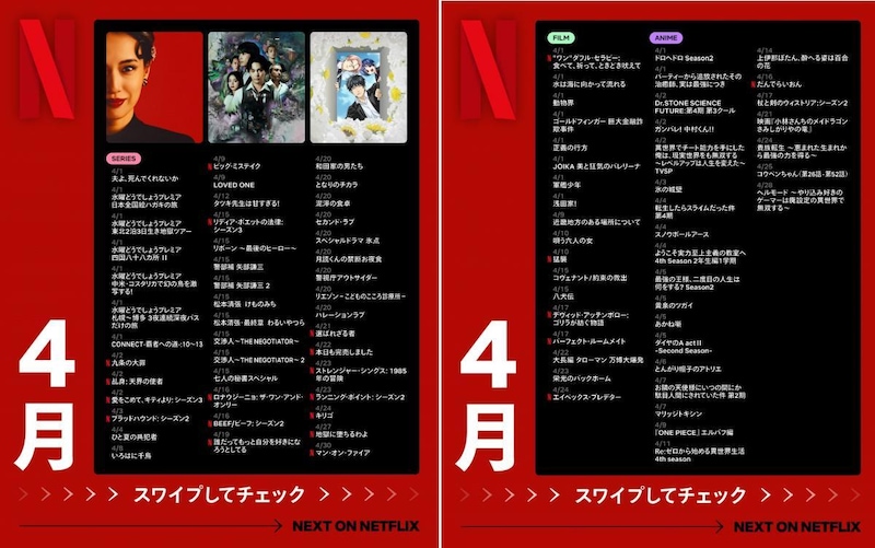 Netflixの公式Xアカウント(@NetflixJP)では、4月の新作タイトルのカタログを公開中です(4月1日~)。こちらも参考にしてください。