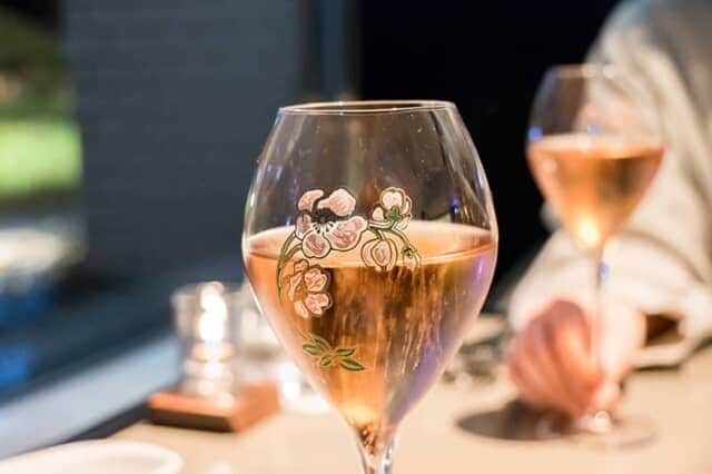 グラスにはメゾン ペリエ ジュエを象徴するアネモネの花が描かれています。これは世界的なガラス工芸作家ミエール・ガレが思う「ペリエ ジュエ」の印象を優美な曲線で描いたジャパニーズ・アネモネ(シュウメイギク)がモチーフ。さくらの季節にピッタリの一杯でした。
