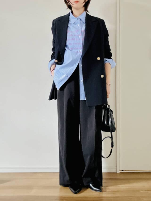 例えば、ややオーバーサイズのシャツを選び、袖口からカフスを覗かせるだけでも、こなれた印象に。さらに、ライトブルーや淡いピンクなど、柔らかさのあるカラーを取り入れると、ネイビーの硬さがほどよく中和されます。ロゴ入りシャツでさりげなく遊び心を加えるのもおすすめ。真面目すぎないバランスが、今っぽさにつながります。