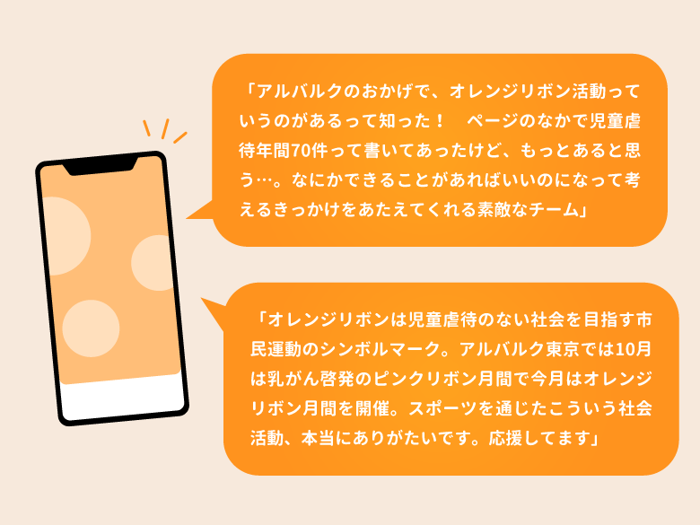 アルバルク東京はこの活動を1人でも多くの人に知ってもらい、児童虐待を根絶しようと、2021年から活動をスタート。こども家庭庁が11月を「オレンジリボン・児童虐待防止推進キャンペーン」の期間と定めたことから、毎年11月に啓発活動を実施している。