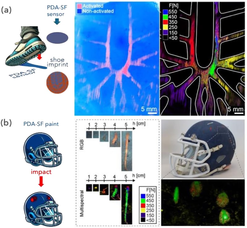 研究者らは、ヘルメット模型に塗って衝撃がどこにどう広がるかを調べたほか、踏みつけによって足裏の力の分布を可視化する(靴の中敷きへの応用)実験も行われました。