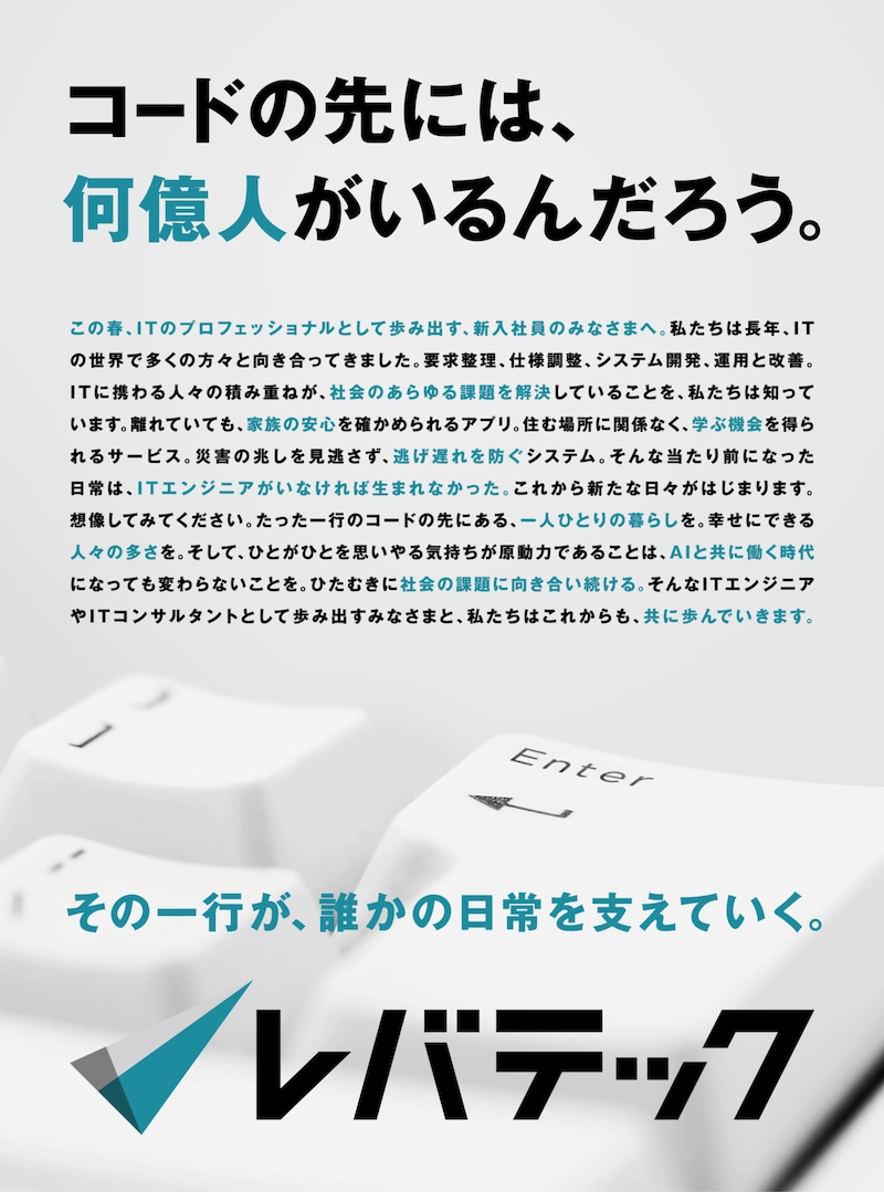 IT人材サービスを展開するレバテックは、2026年3月31日付の日本経済新聞全国版にて、この春ITエンジニアとして社会人の一歩を踏み出す新入社員に向けた新聞広告を掲載した。
