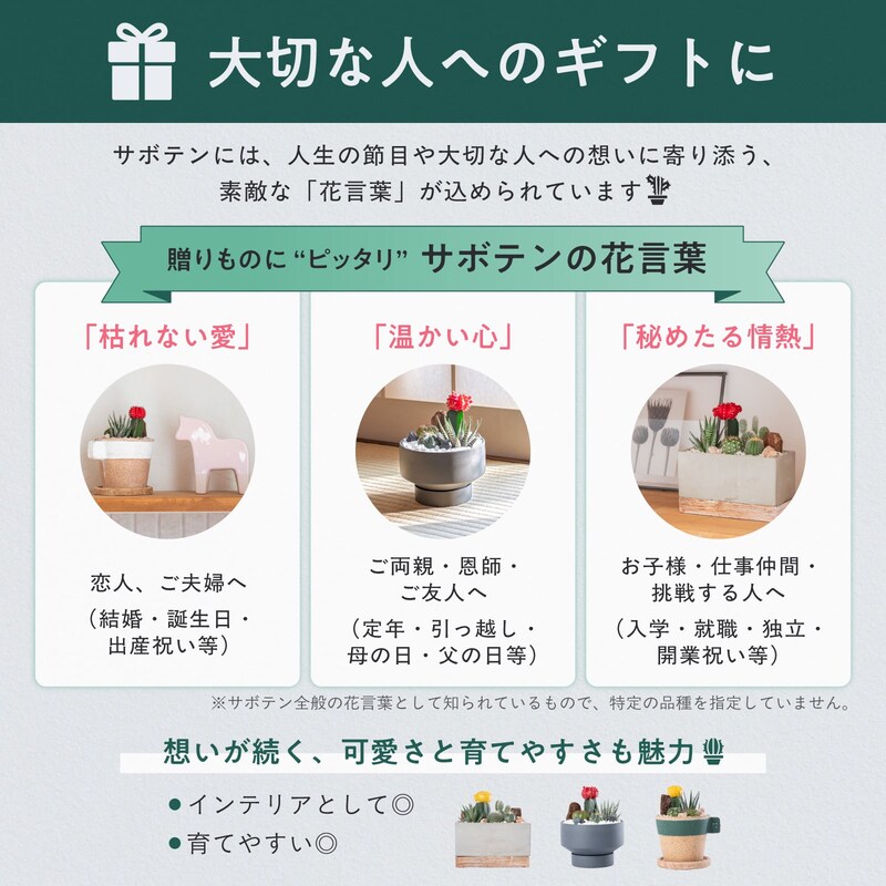 春の模様替えや、ちょっとしたギフトに。“枯れない愛”を意味するサボテンを、気軽に取り入れてみてはいかがでしょうか。