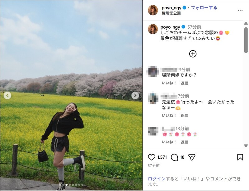 ゆきぽよは「しごおわチームぽよで念願の 景色が綺麗すぎてCGみたい」とつづり、写真を投稿。満開の桜を背景に黒のへそ出しショート丈パーカーにショートパンツ、ハイソックス、スニーカーのコーディネートでお花見を楽しむ様子を披露した。