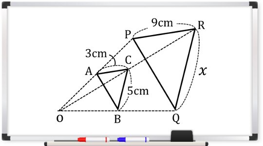 図のxの長さはわかりますか? これは相似という比率が同じ図形を利用した問題です。△ABCの2辺の長さがそれぞれわかっています。相似の△PQRの辺PRが9cmならxは……?