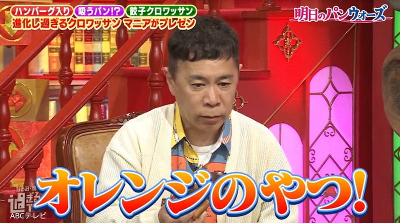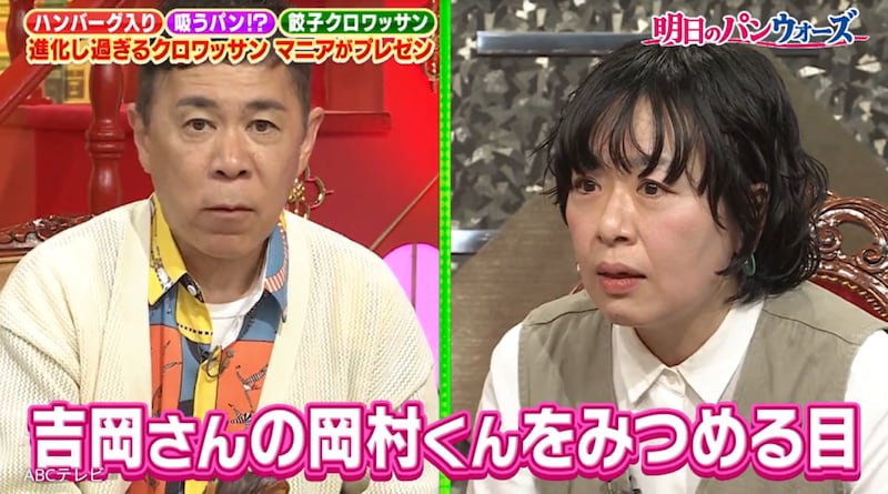吉岡の熱視線に気づいていないのか、岡村は「何このパリパリ感!」「チョコレートと中のオレンジのすっぱさがマッチしてすんごい良い感じ!」と食リポ。自分が推すパンをおいしそうに味わってくれた岡村に、吉岡は喜びながら熱視線を向け続け、「外ザクザク、中がちょっとしっとりしていて……」と解説した。