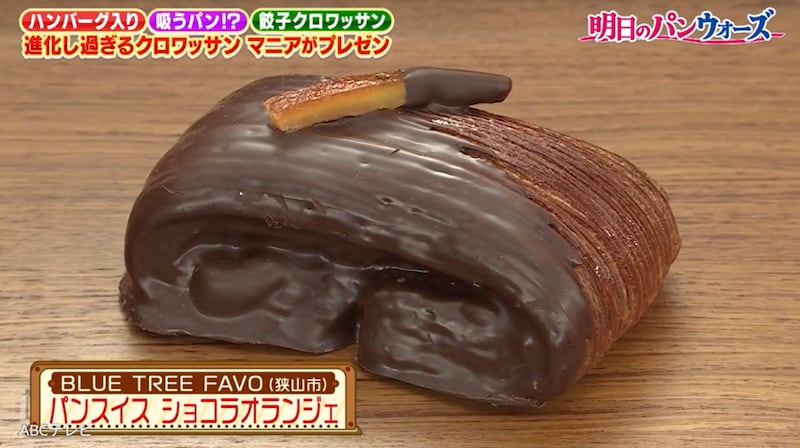 岡村が選んだ1つは、狭山市の住宅街にあるBLUE TREE FAVO(ブルーツリーファボ)の“パンスイス”ショコラオランジェ。パンスイスとは、生地にクリームを入れて丸ごと焼き上げた進化系クロワッサンのこと。ショコラオランジェは、生地表面がチョコレートでコーティングされ、オレンジピールがトッピングされているタイプだ。