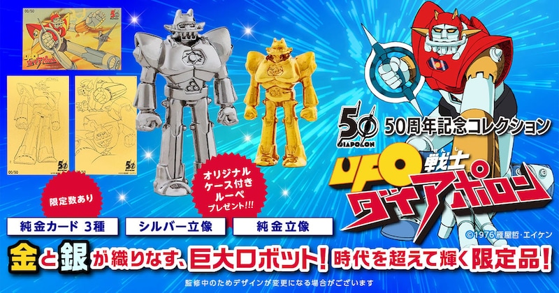 「UFO戦士ダイアポロン 50周年記念コレクション」(金きゃらじゃぱん)は、純金立像、銀製立像、純金カードを展開中