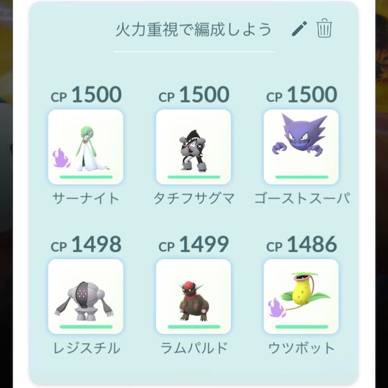 ▲重要なのはとにかく火力。CP1500までであれば、シャドウポケモンのデメリットである育成コストが気にならないレベルなので「シャドウサーナイト」などの火力重視なポケモンを多く編成しておきましょう。