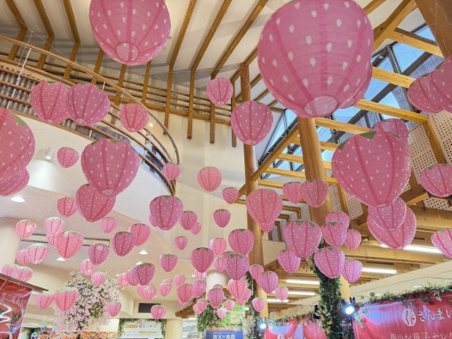 店内は150個ものいちご提灯で装飾。