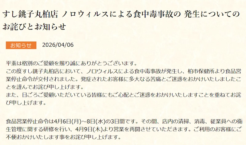 すし銚子丸は、ホームページで「発症されたお客様に多大なる苦痛とご迷惑をおかけしましたことを謹んでお詫び申し上げます」と謝罪した。