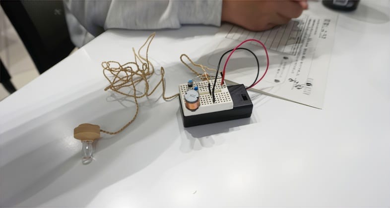 このワークショップの特徴は、単に完成されたものを使うのではなく、自分の手で一から組み立てる点にあります。参加者はまず、金属探知機の仕組みについて説明を受けたあと、ブレッドボードと呼ばれる基板に配線を行いながら装置を組み立てていきます。