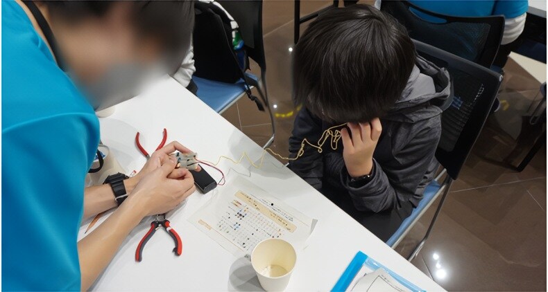 当日は、千葉県内の小学生やその兄弟など、合わせて48名がワークショップに参加しました。会場では、配られた材料を切断したり、曲げたりしながら形を整え、ブレッドボードに配線を行う作業が進められていきます。