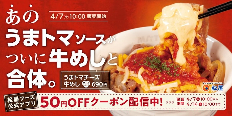 松屋は、2026年4月7日10時から「うまトマチーズ牛めし」を販売しています(一部店舗を除く)。