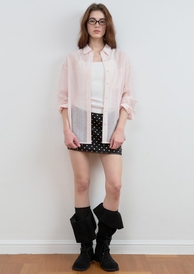 控えめなストライプ柄とライトピンクのシアー素材がトレンドライクな一枚。