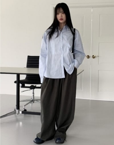 写真は、爽やかなブルーのストライプシャツに、バレルレッグパンツを合わせてこなれ感をプラスした着こなし。